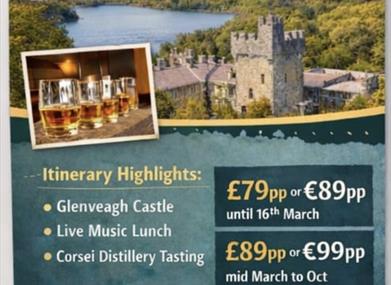 Visit the historical An Grianán Fort with 360 views from a height. Explore Glenveagh National Park, castle and tea room. Lunch included with live music. Crolly whiskey Distillery tour with malt whiskey drink also full bar on site. Travel home on our merry way laughing and singing after a great days craic ideal for groups of family/friends and visitors alike